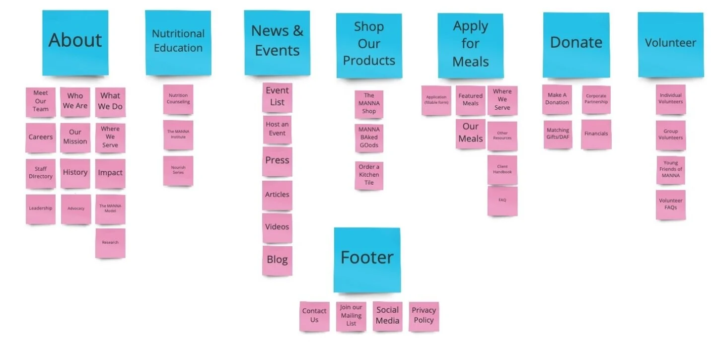 Current Navigation: Once we understood what content we needed, we sorted through over 150 sections, sub-sections, and sub-sub-sections of MANNA’s website. We did a card sorting activity and tested with three different users to come up with our first draft. In the card sorting activity, users were asked to group the sticky notes into categories of the current navigation.