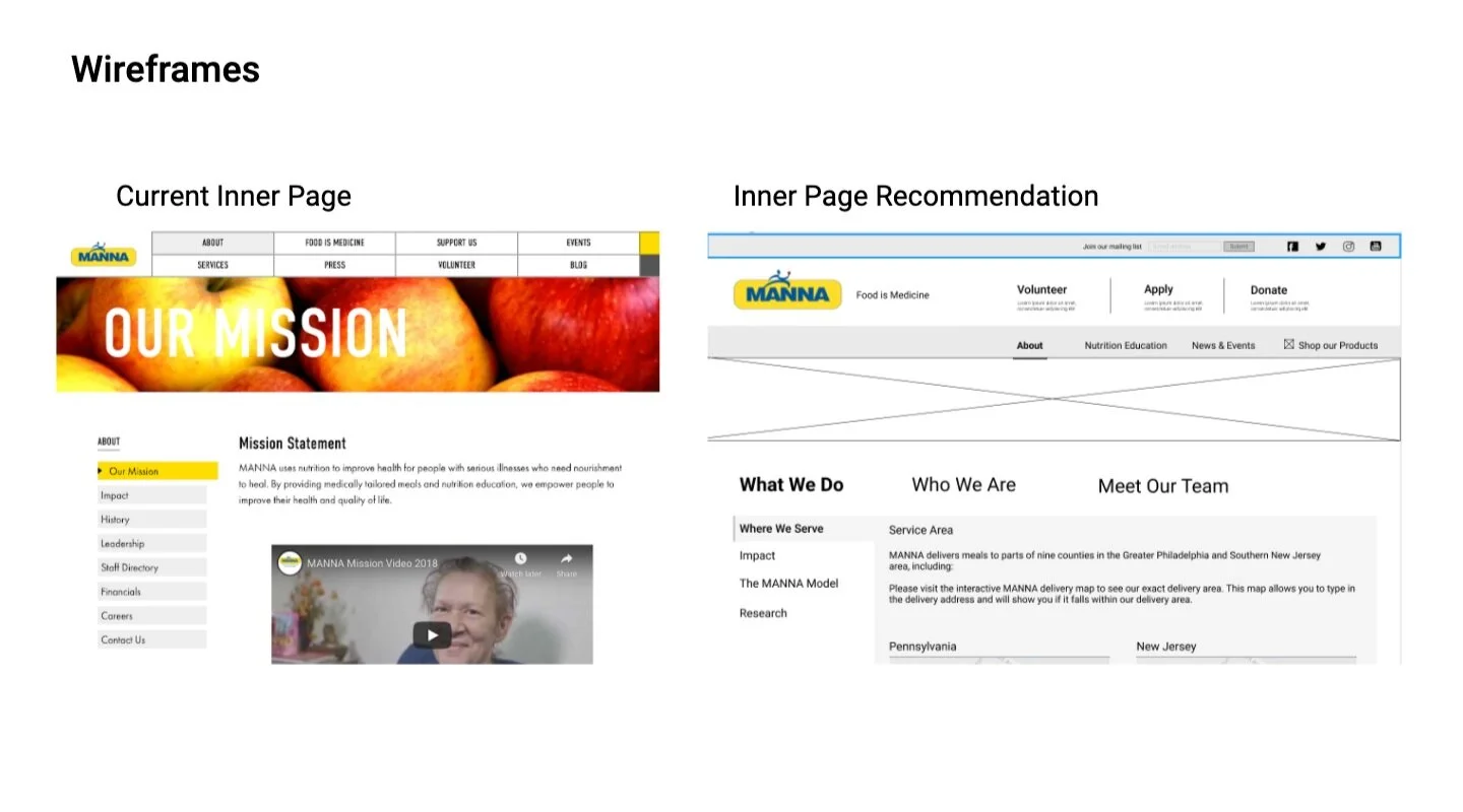 Current Navigation: Once we understood what content we needed, we sorted through over 150 sections, sub-sections, and sub-sub-sections of MANNA’s website. We did a card sorting activity and tested with three different users to come up with our first…